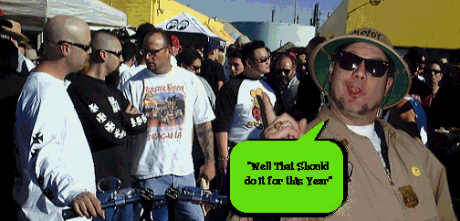 " Well gang everyone is about cleared out and I've had a big day and I gotta long drive home ahead of me.... so listen like always we all want to thank all of you that came out ta visit us this year, .... Looks like we will have 'ta finely get a bigger facility for our Rat Fink Reunion next year also don't for get we got our Rat Fink.Party and Kustom Kulture Extravaganza comin' up this next summer... If Moldy missed some pictures of yer favorite artist just send'em in and he'll post'em " You all Take care Now and we'll See ya real Soon...Ed "...... |